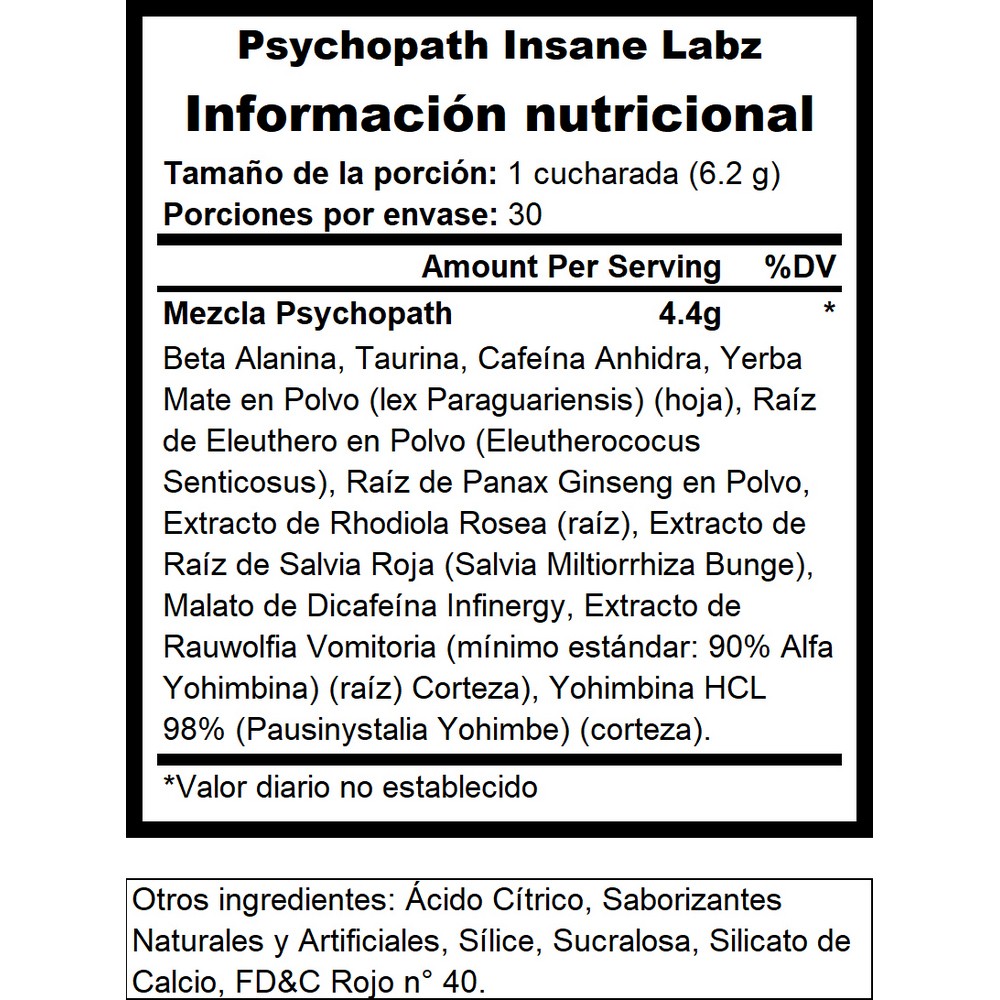 Fuera del gimnasio puedes ser una persona normal con una rutina común, pero cuando cruzas esas puertas... ¡las reglas cambian! Creado desde la mente retorcida de The Mad Chemist, Psychopath de Insane Labz no es un suplemento para novatos o para quienes buscan un entrenamiento ligero. Es una fórmula extrema, cargada de ingredientes patentados y diseñada meticulosamente para llevar tu energía, fuerza y concentración a un nivel de absoluta locura.