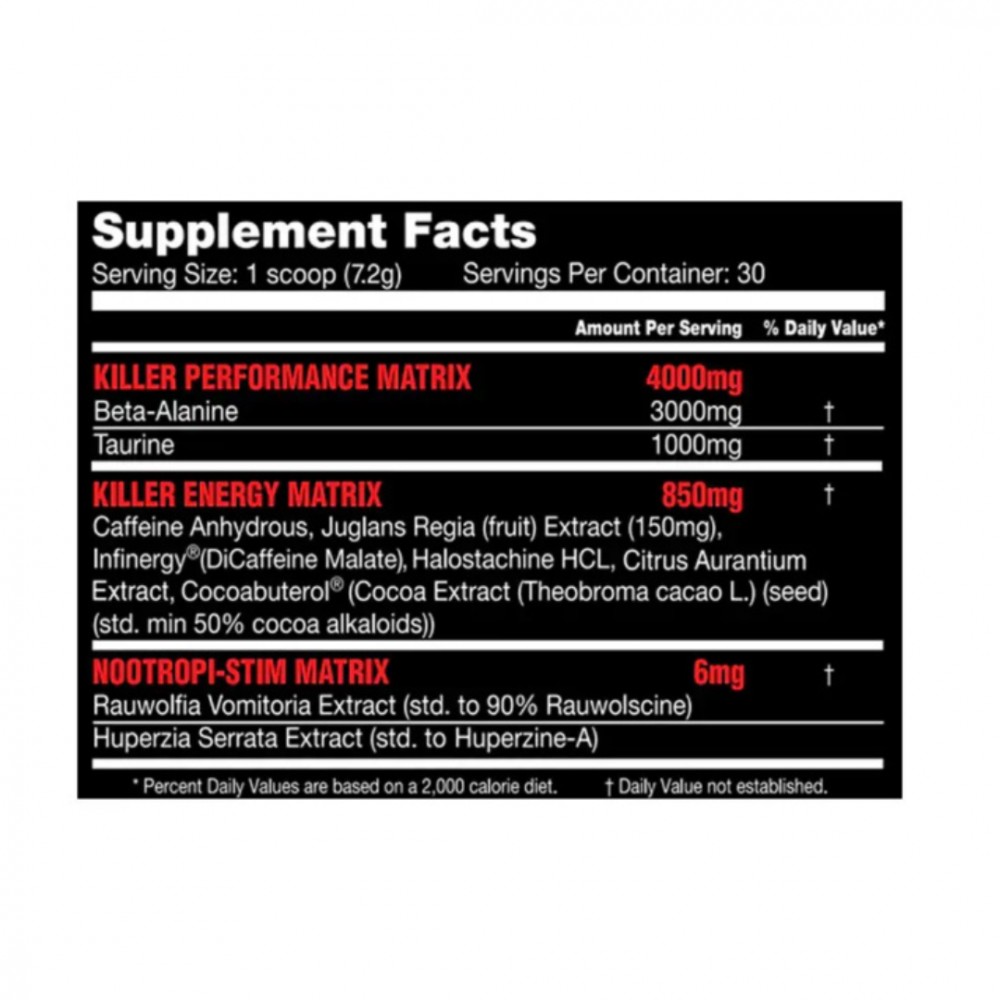 Killer Labz Stim Reaper es un pre-entrenamiento intenso de energía y concentración que presenta la combinación más fuerte de estimulantes que aumentan la adrenalina.